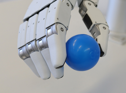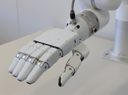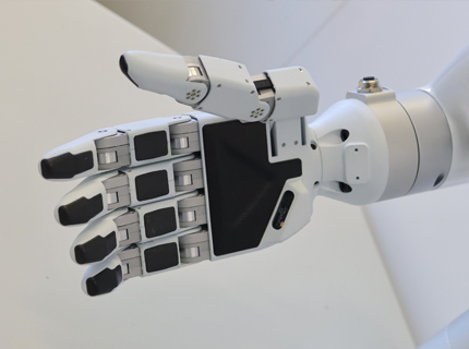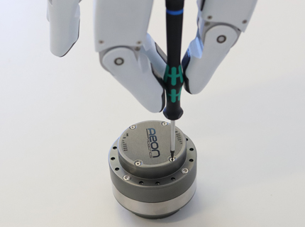 The HandEffector is a robotic gripper modeled after the human hand and forms the core component of the DROID robot system. It uses integrated sensors and AI processing to learn gripping motions and forces. A Quasi-Direct-Drive (QDD) technology with field-oriented motor control enables torque sensing inside each joint to create a depth-sensitive sense of force. This enables training and grasping of even sensitive objects, such as food, glass or soft packaging materials. The integrated camera and AI processing enables grasp adaption, quality assurance and process monitoring during pick and place operations. The ISO 9409-1 compliant mounting adapter enables easy integration to upgrade existing industrial robots to an intelligent robot solution.